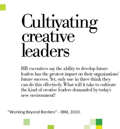 In a companion study, “Working Beyond Borders,” IBM collected data from over 700 companies in 61 countries and spoke to 600 senior global human resource leaders. Not surprisingly, CREATIVITY was their Number One concern, as well. Download the report as a pdf.