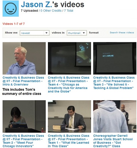 In the first offering of the class, we mixed presentations with performances. We had experts visit the class. We got up on our feet and did small group work and creativity exercises. We visited creativity hot spots around Chicago and learned from their leaders on how to make environments that nourish innovation. We learned about and worked on 13 distinct personal creativity competencies. Finally, students worked in teams on special projects and presented their research as performances during the last class before an invited audience. This class began on January 15, 2011. Our final class was on April 30 and we had four teams of students PERFORM their final projects. It was a spectacular display of applied creativity. Watch the performances here: